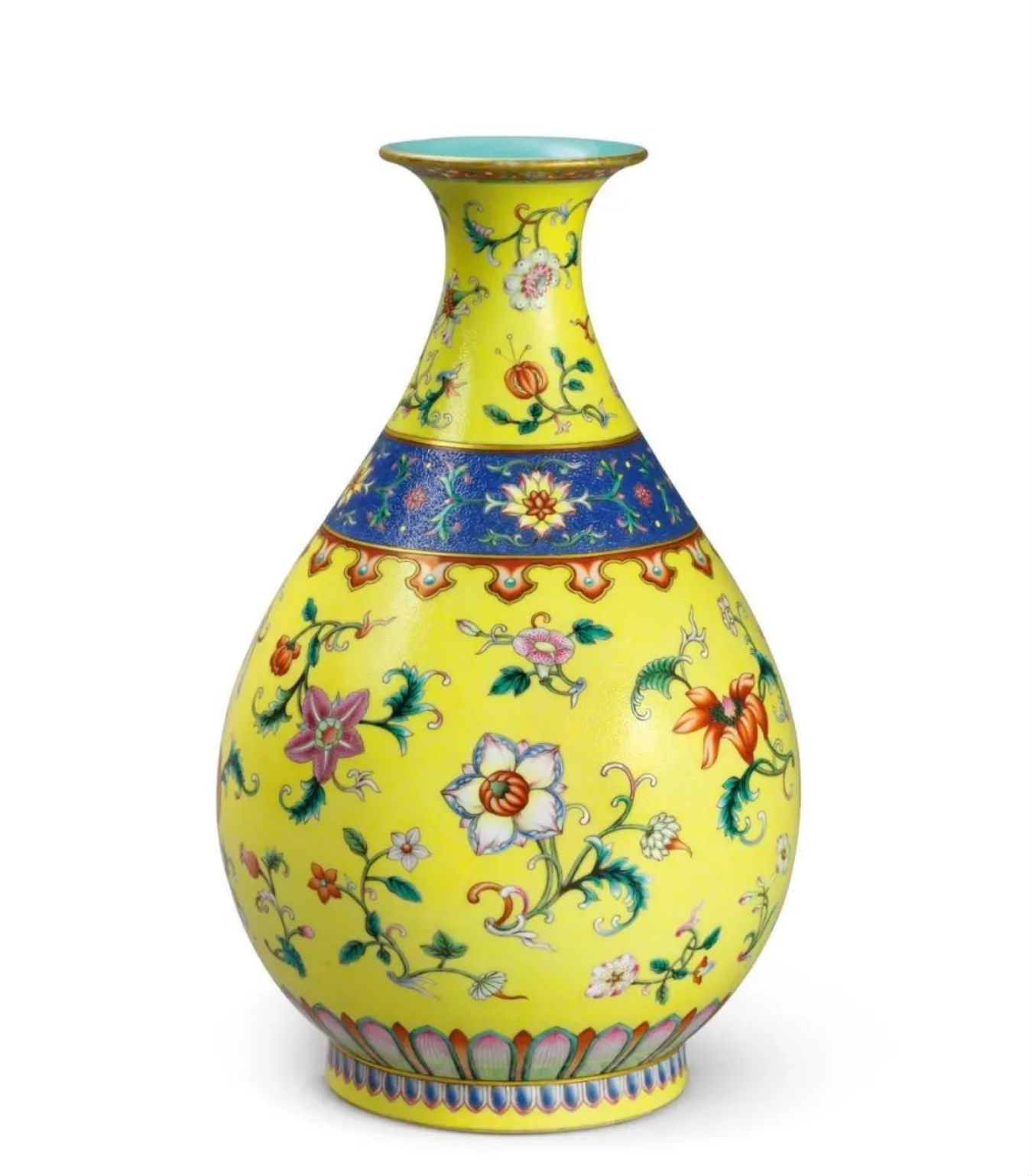清乾隆 黄地轧道洋彩折枝花卉纹玉壶春瓶