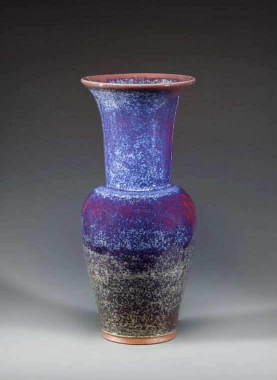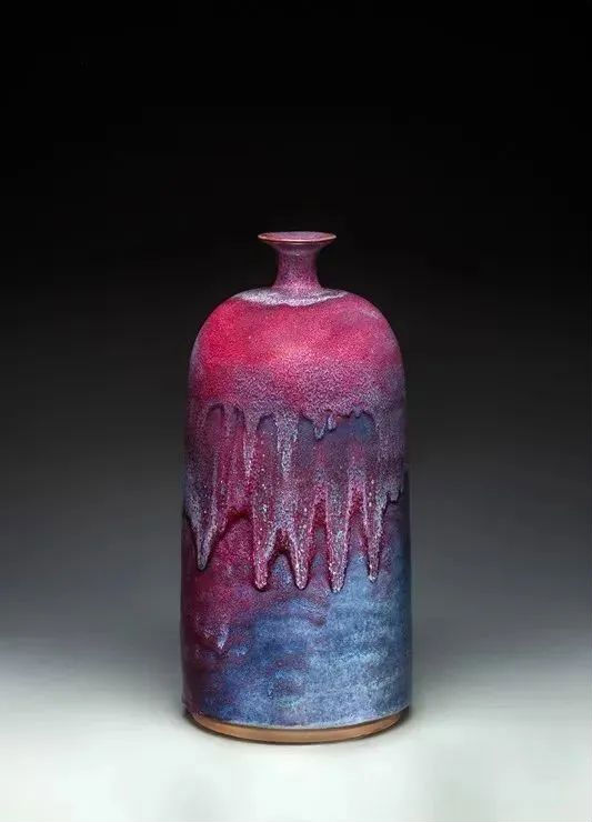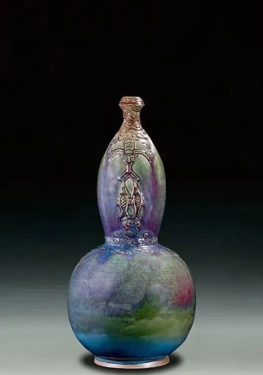 晋晓瞳的作品以“釉层丰厚、窑变奇幻”著称,代表作《牵牛花瓶》获2008年香港国际陶瓷大赛金奖并被英国国家珍宝博物馆收藏;《乳钉罐》《凌霄花瓶》等被故宫博物院、中国国家博物馆永久珍藏。他独创“炉钧新花釉”,融合唐宋美学,需特定气候烧制,成为晋家钧窑的标志性风格。