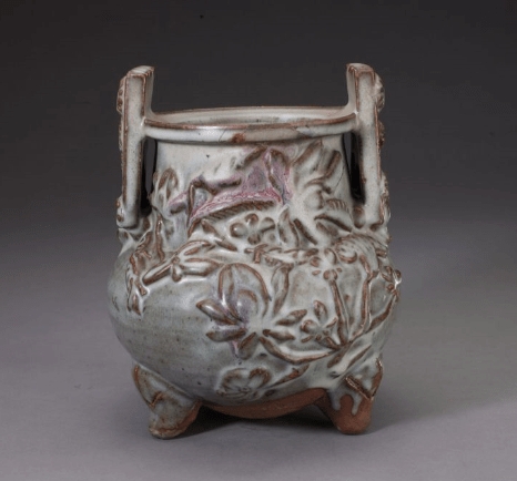 炉平口,深腹,内凹式圈足,底下承以三足。口沿上对称置冲耳。里、外施月白色釉,外底有垂釉痕。圈足无釉,铁褐色胎,胎质细腻坚致。外壁及耳面塑贴折枝花卉纹装饰。