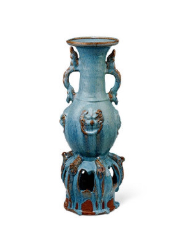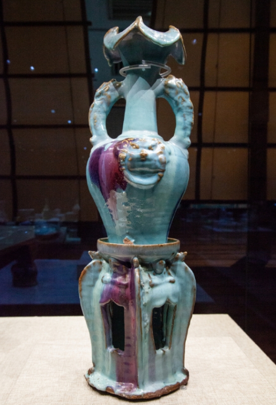 此瓶上为瓶,下为座,瓶座相连。花口,颈肩之间附对称的摩羯形双耳,腹部前后两面雕贴虎头铺首衔环,瓶座镂空,呈五兽驮负宝瓶形状。器形高大,表现出元代钧窑瓷器的特点。